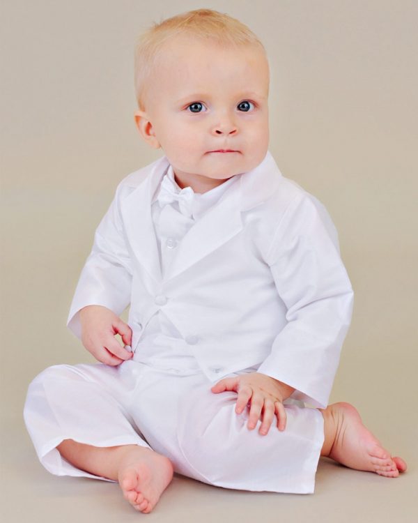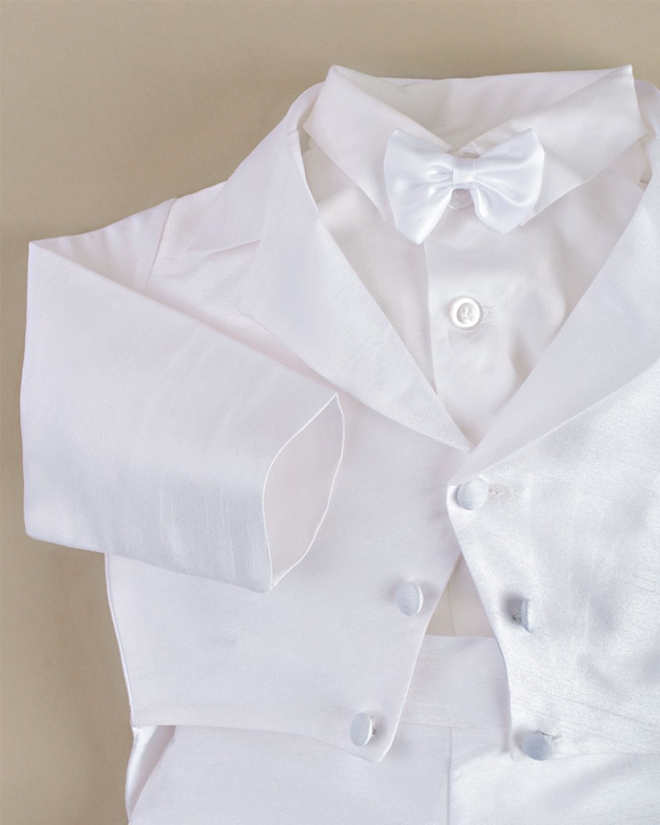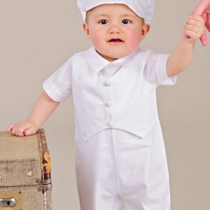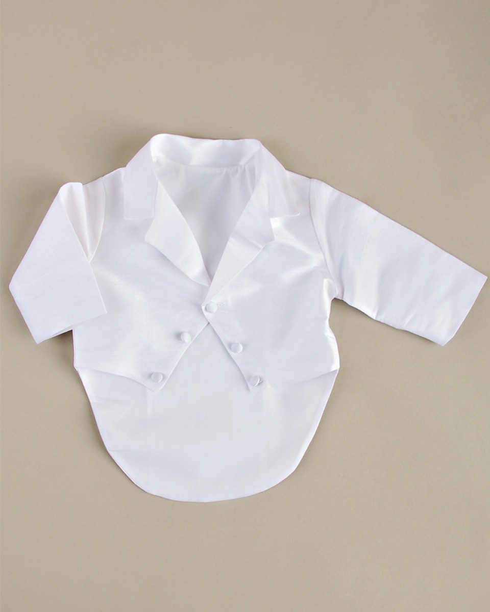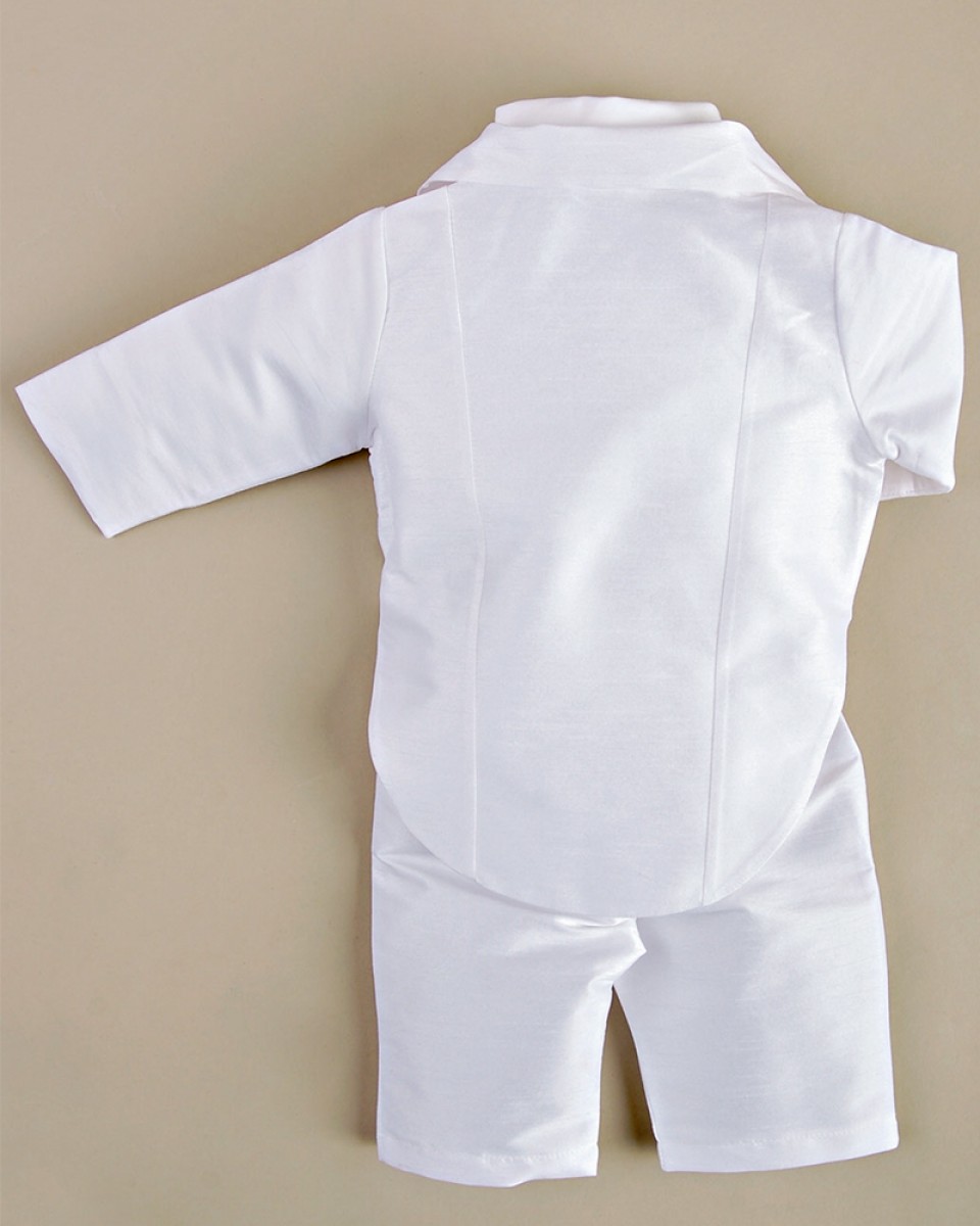 This dressy shantung tuxedo features a bodysuit-style shirt, guaranteeing baby won’t be coming untucked during his special event!