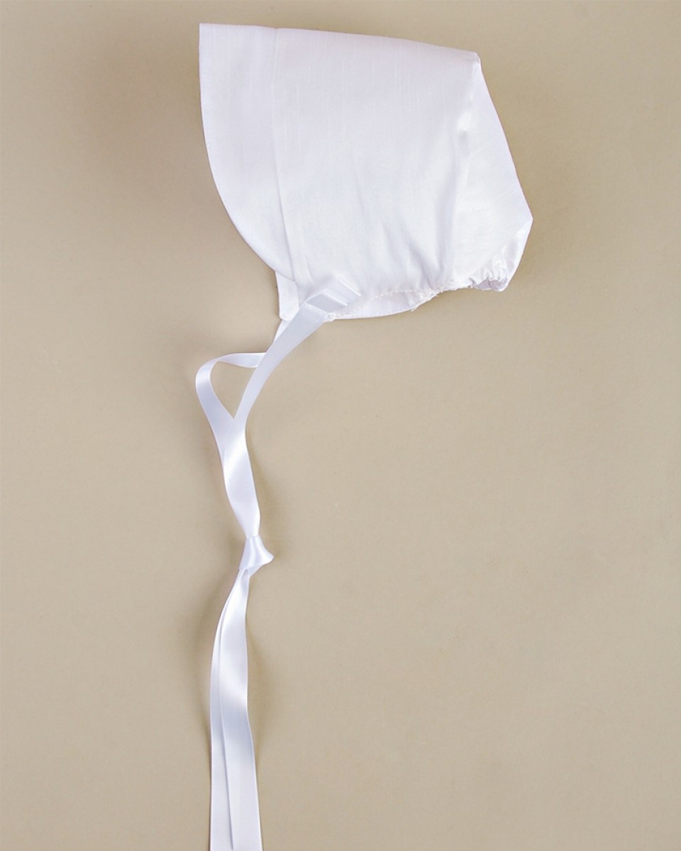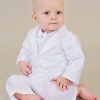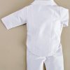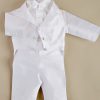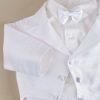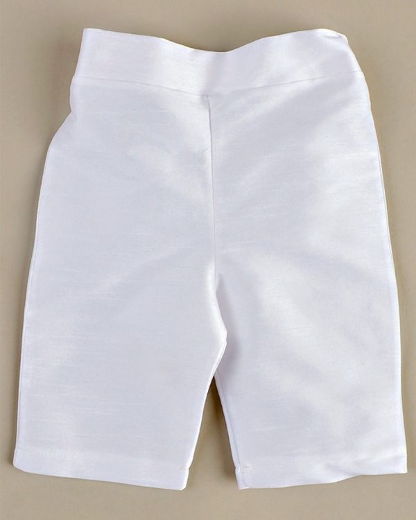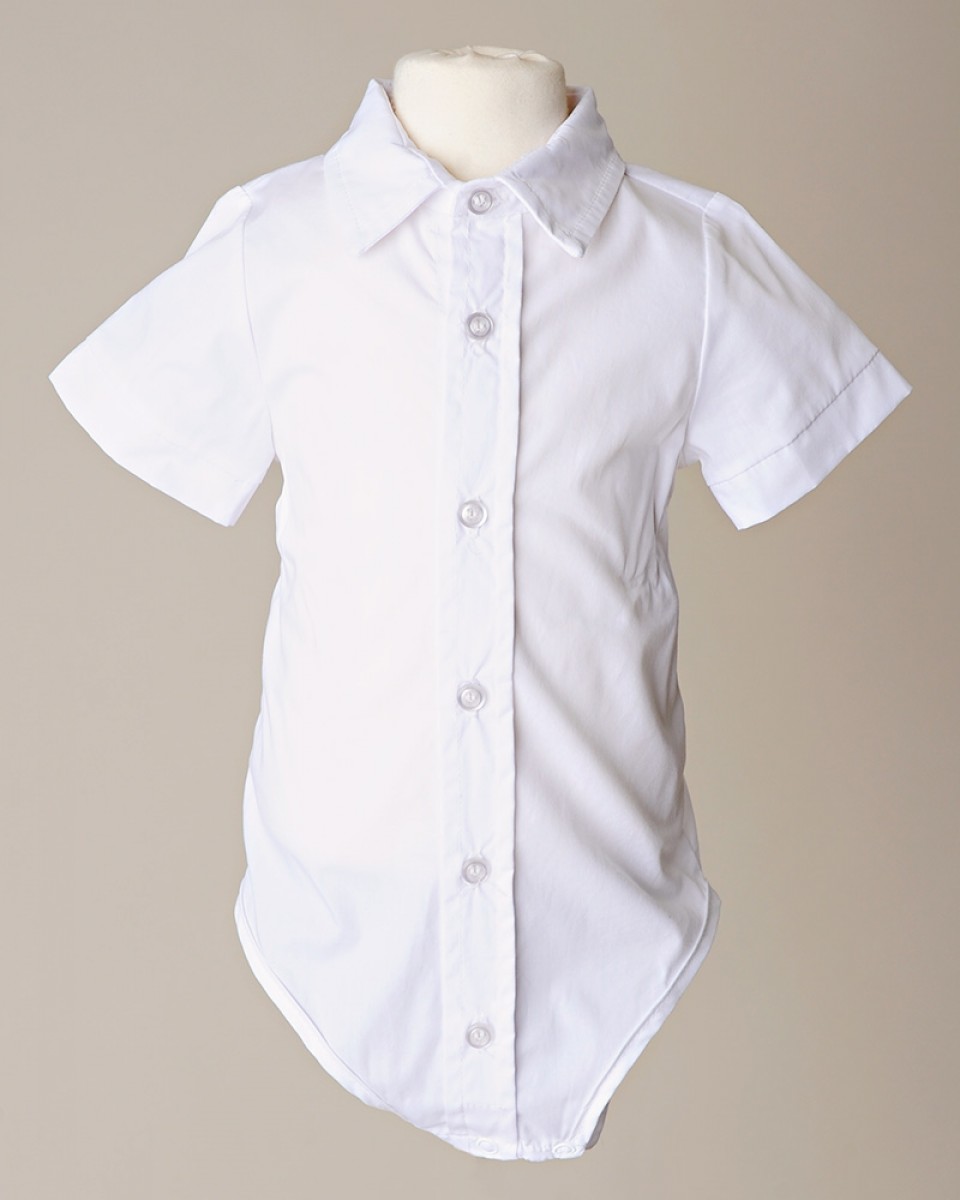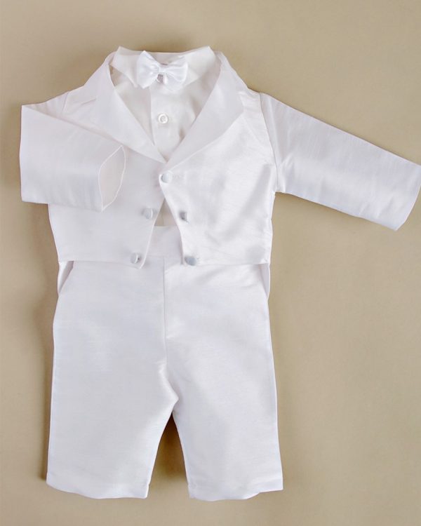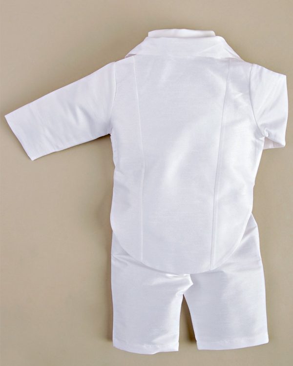 This dressy shantung tuxedo features a bodysuit-style shirt, guaranteeing baby won’t be coming untucked during his special event!