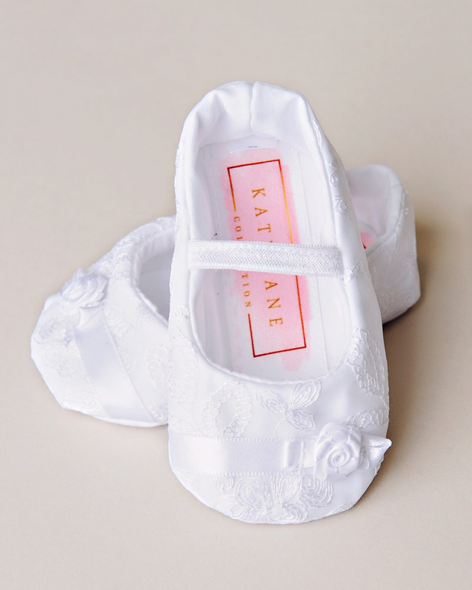 Dainty and sweet is the only to describe our Sarah Christening Slippers. Delicate embroidered organza drapes over a soft cotton–garnished with satin ribbon trim and pretty rosette!