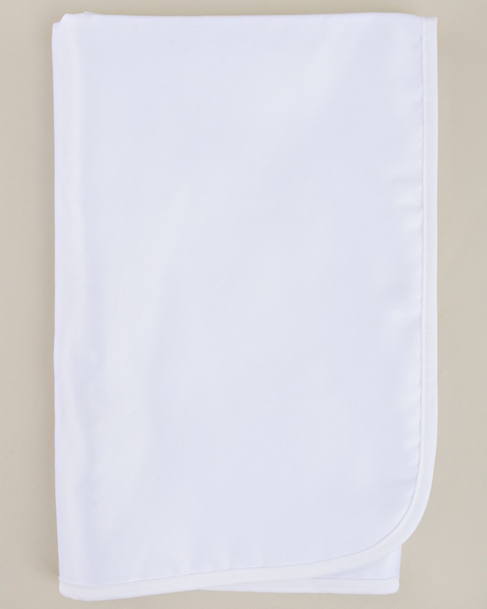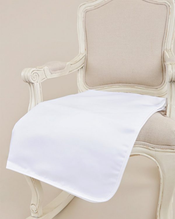Our beautiful christening blanket of lustrous pure white satin is finished with simple bias binding around the edges.