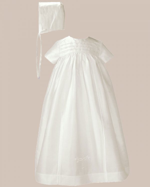 Beautiful 100% silk dupioni family special occasion christening gown. Features short sleeves with eloquent pin tucked bodice and embroidered cross above the hem. This dress measure 26 inches in length, please see the size chart in the images for more accurate fitting measurements. Includes matching bonnet and slip. The Little Things Mean a Lot Heirloom Preservation Bag is recommended for long-term storage. This family gown is perfect for Christening, Baptism, Baby Blessing, or any special occasion such as weddings, church presentations, dedications, and keepsake photos. Dry clean only. – (Please note that all silk fabrics have slubs which are an inherent part of the fibers and add to the individuality of the set. These should not be mistaken for flaws in the fabric.) (DP03GS)
