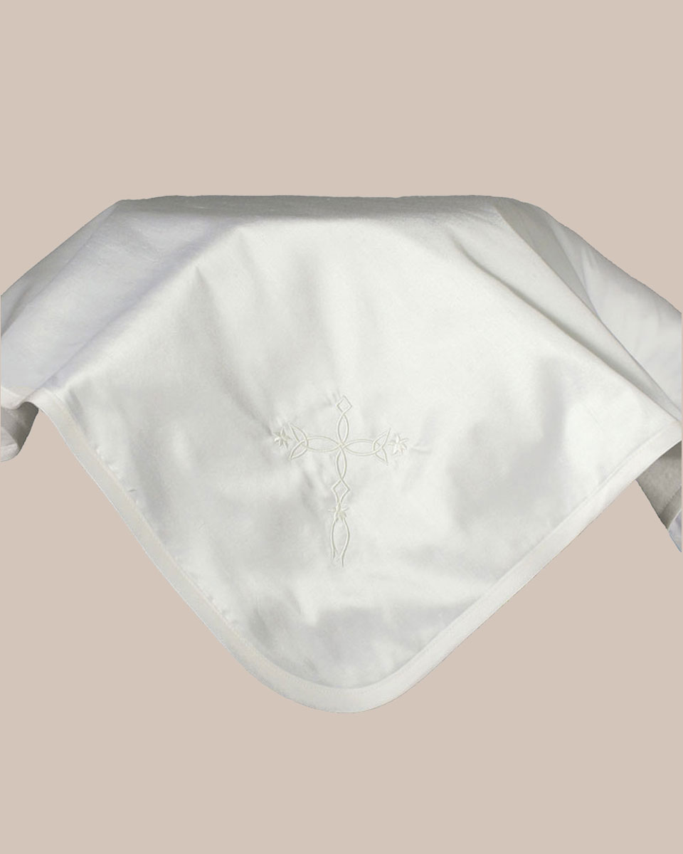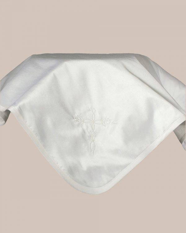 Champagne (Slightly off white) Silk Dupioni blanket with embroidered cross in one corner. All natural silk fabrics have slubs which are an inherent part of the fibers and add to the individuality of the set. Backing is 100% cotton flannel. Approximate size: 30″ x 40″. (3DPBLKC)