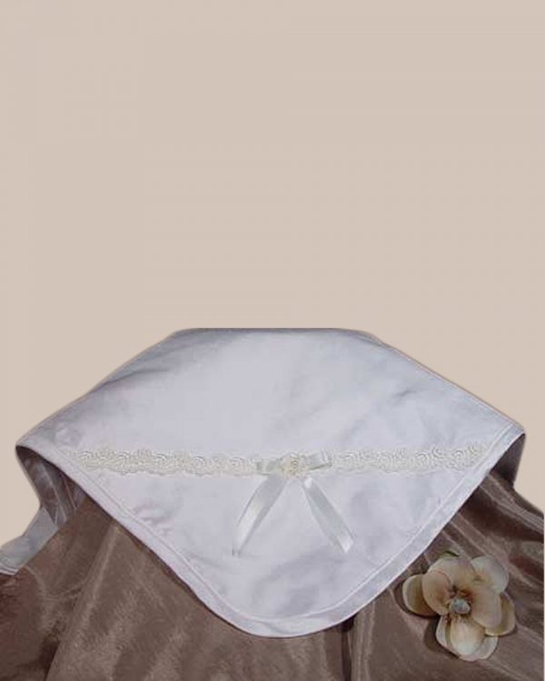 Champagne (slightly off white) Silk Dupioni blanket with rayon venise trim, poly satin bow and a small crochet applique in one corner. Approximate size: 30″ x 40″.