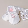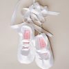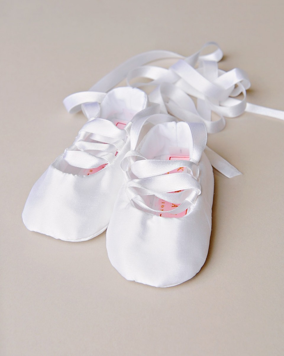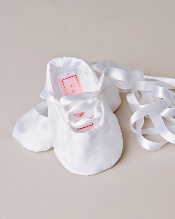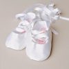Develope your little ballerina with these graceful silk slippers that lace up the foot with pure silk ribbons. Add baby’s name to the bottom of one shoe to make them a cherished keepsake!