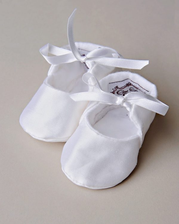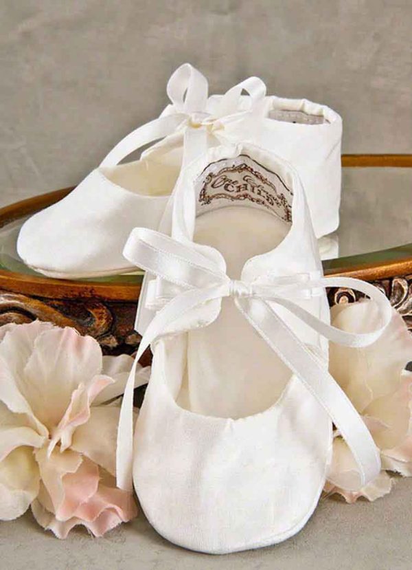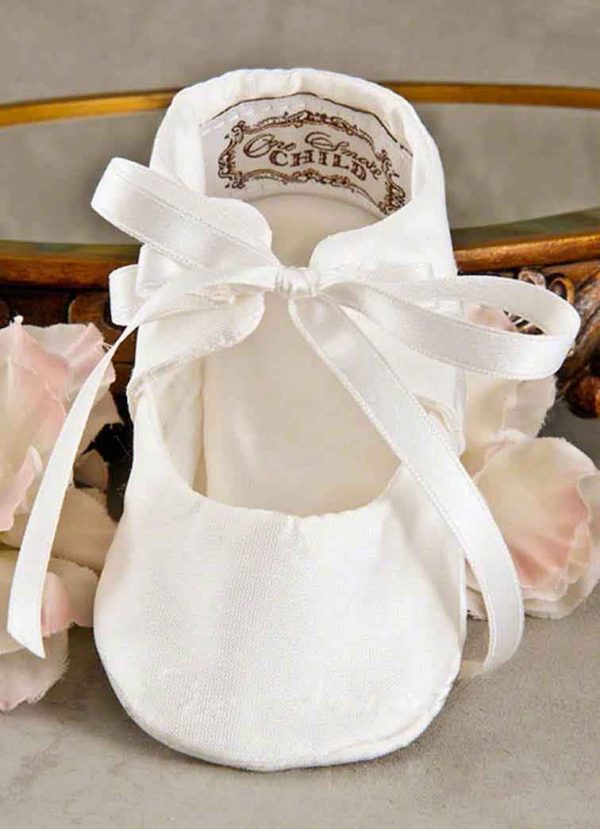 Elegant styling and handmade construction make our dainty silk slippers a perfect match for any heirloom outfit. Available up to infant size 4.