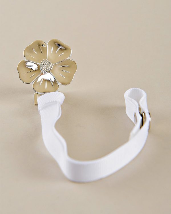 Graceful silver petals and pristine white ribbon keep her pacifier clean and handy, while adding a special feminine touch to any outfit. Please note: Our clips are very sturdy and well-made, but as with any jewelry, there is the possibility of breakage and therefore must be used only under adult supervision.