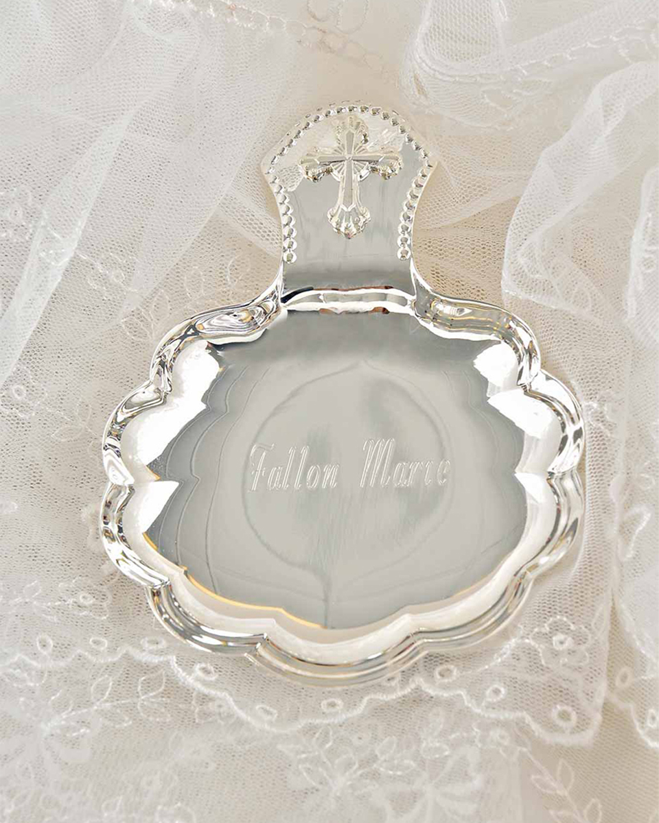 This gorgeous silver-plate baptismal shell with intricate cross embellishment is personalized for baby’s special day: add engraving for only a penny!