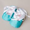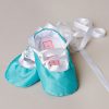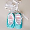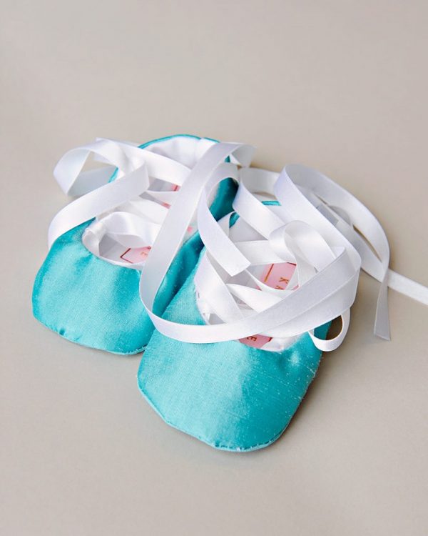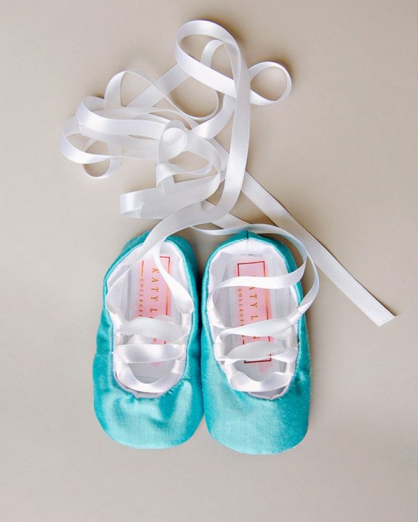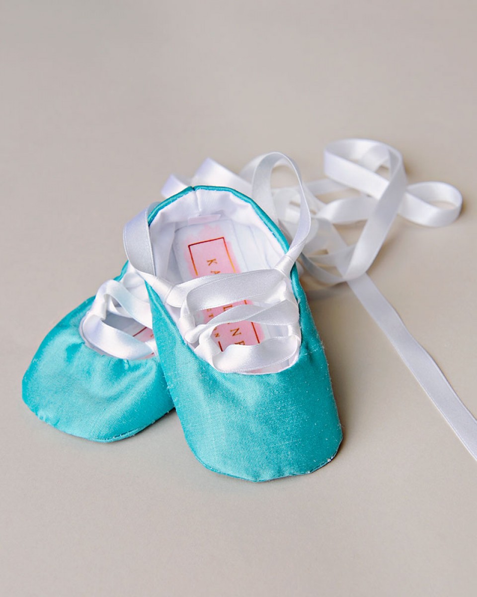 Beautiful turquoise silk paired with pretty silk ribbon lacing make these soft-constructed slippers a perfect match for our Skye dress!