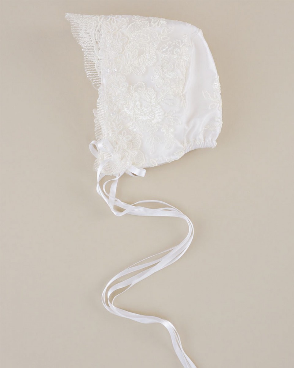Grace the head of your little one with the simple beauty of this re-embroidered lace christening bonnet.