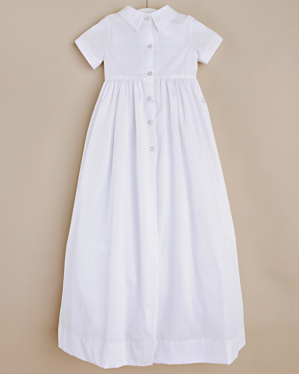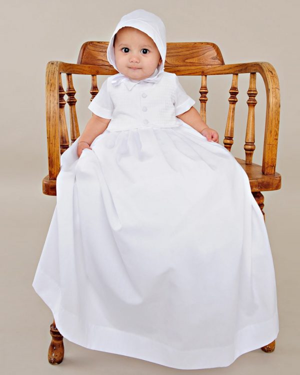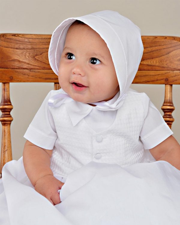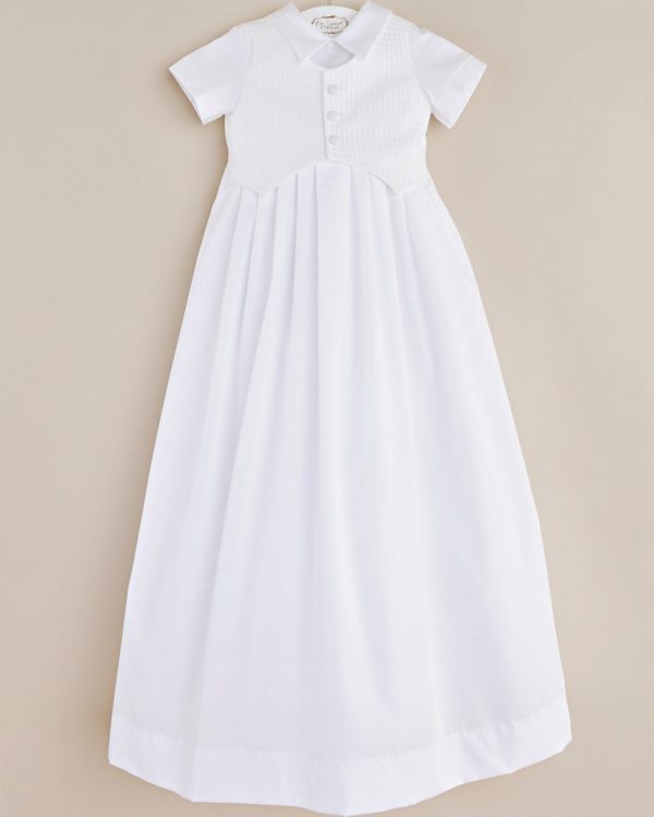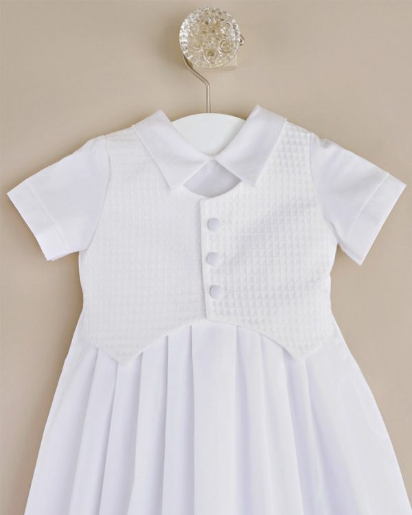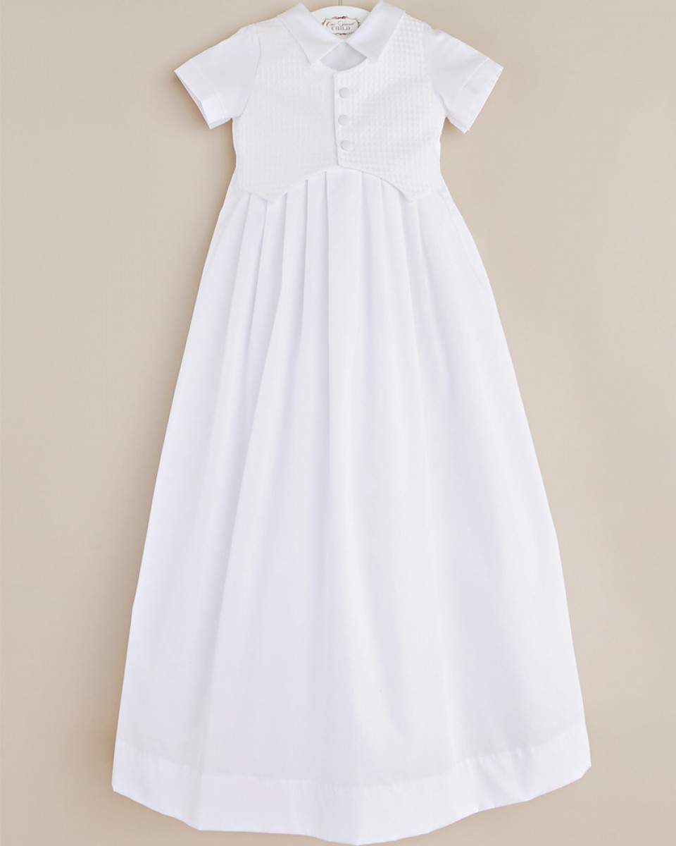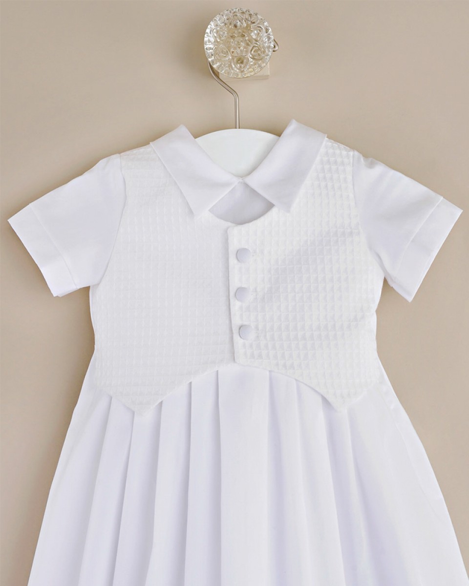Classic and contemporary influences combine beautifully in this traditional boys christening gown with a modern textured vest.