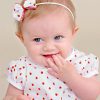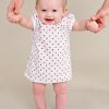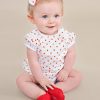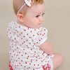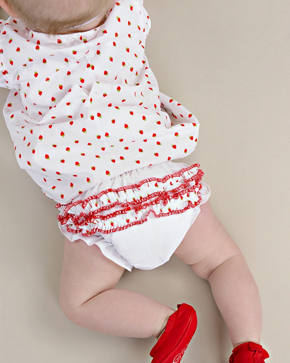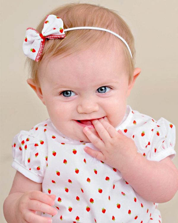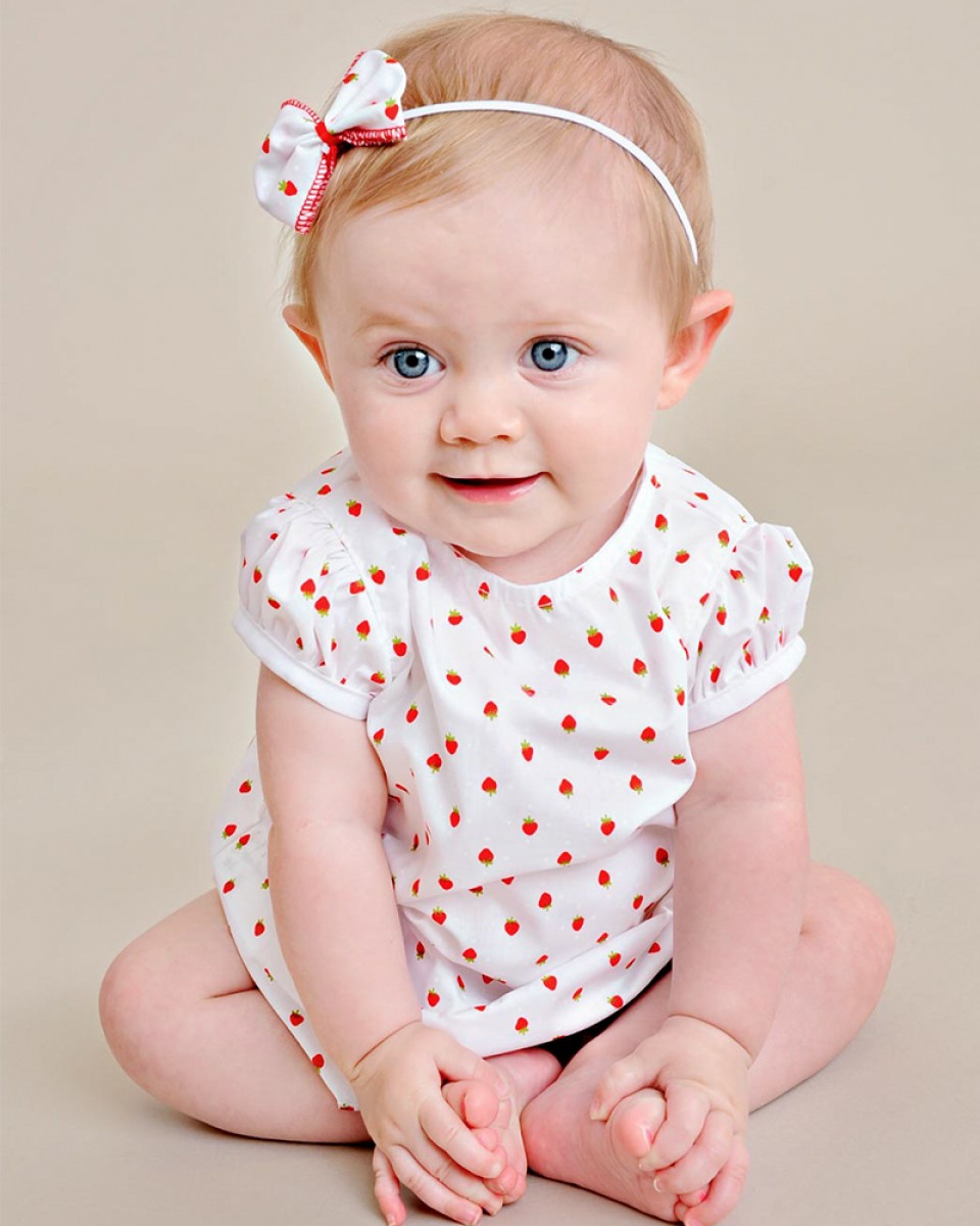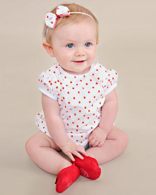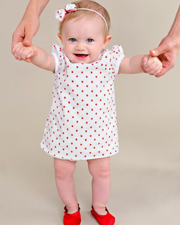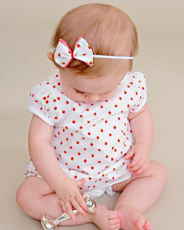 An adorable A-line strawberry print shortie dress with pretty puffed sleeves. Includes matching headband and diaper cover. Perfect for your summer picnic!