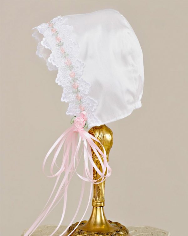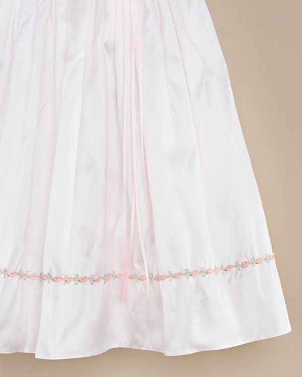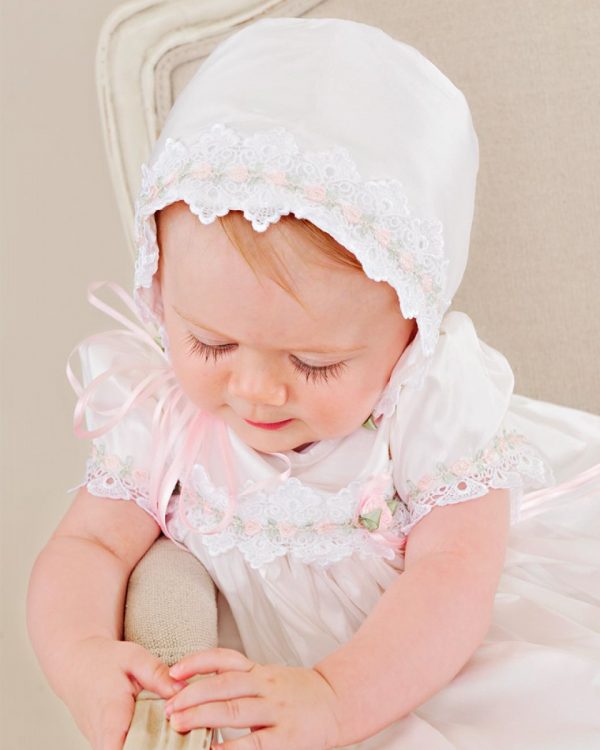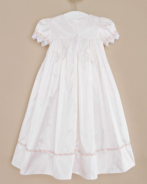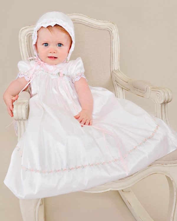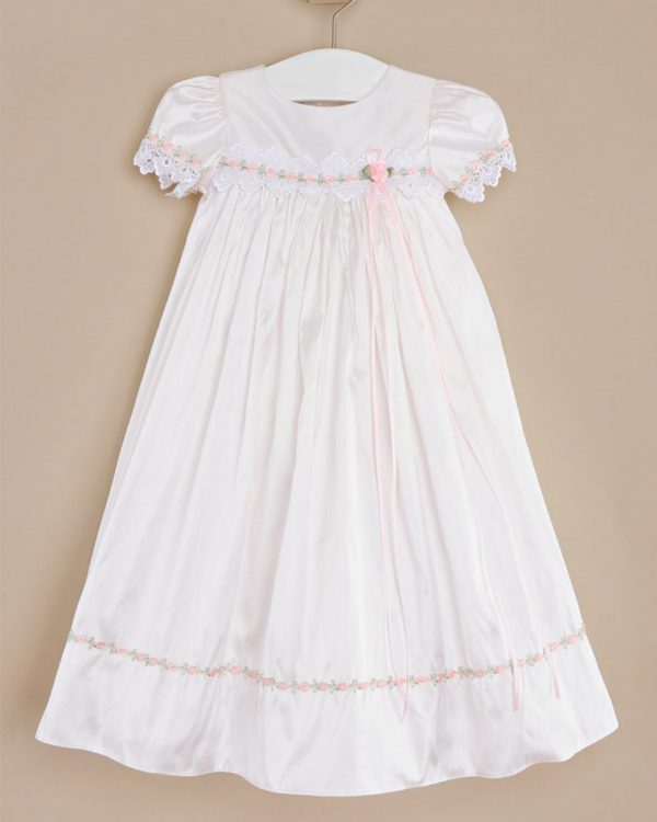 Gentle touches of pale pink take our graceful Tess silk baptism gown from simply pretty to truly exceptional.