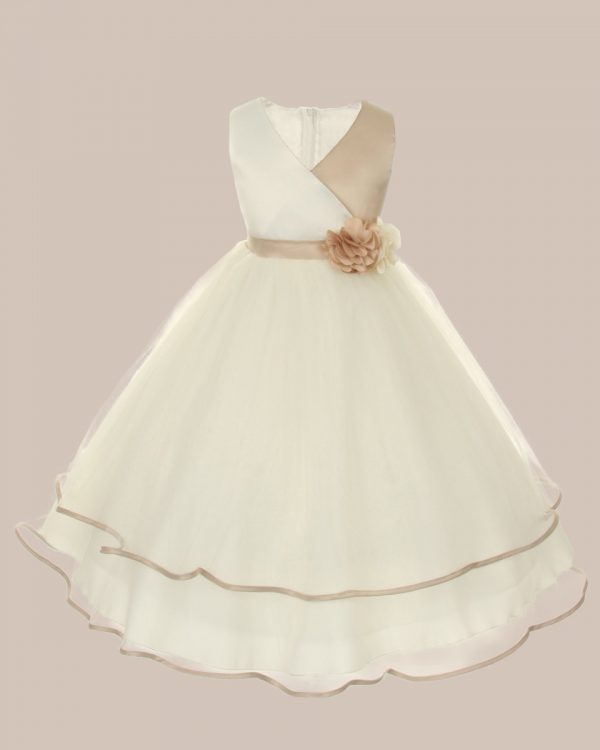 Shop One Small Child » Two Tone Satin V-Neck Full Length Communion Dress with Layered Tulle Skirt
