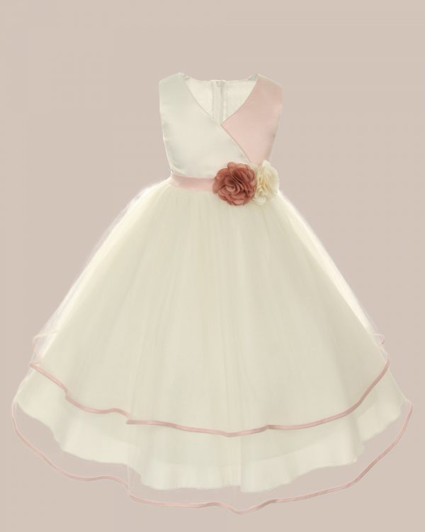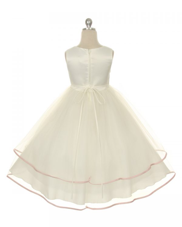 Two Tone Satin V-Neck Full Length Communion Dress with Layered Tulle Skirt