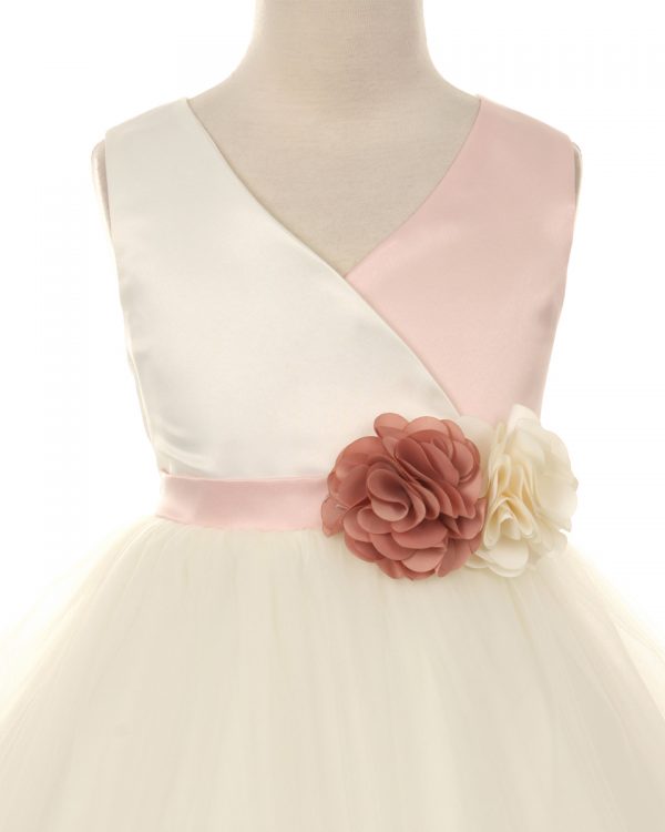 Simply elegant satin v-neck holiday and special occasion dress. Also great for communion. This v-neck full length dress has a bold, sophisticated, and cute look. This satin dress bodice creates a timeless look for your little girl. The Champagne and Rose dress have two toned panels. Two satin ribbons embellish the bottom of the tea length tulle skirt. Comes with two matching satin flowers.