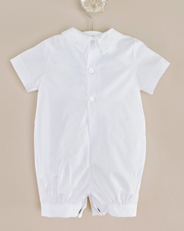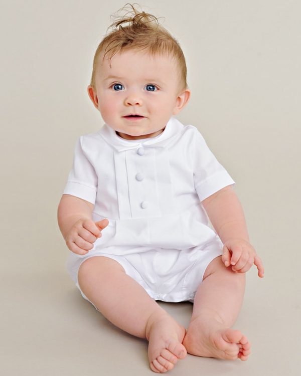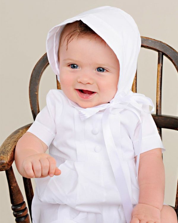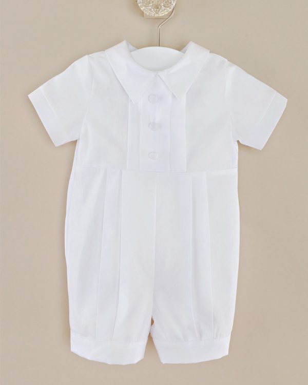 Looking for a sophisticated and elegant outfit for your baby boy’s special day? Look no further than this white cotton short-sleeve coverall set with matching hat. This outfit is made of high-quality 100% cotton broadcloth, a soft and breathable fabric that is gentle on your baby’s skin. The coverall features a pleated front bodice and legs, a pointed shirt collar, and covered button trim for a refined and handsome look. The short sleeves and short pants are ideal for warm weather and comfort. The set also includes a matching hat with ribbon ties and elastic backing for a snug and stylish fit. The hat has a brim to protect your baby’s eyes from the sun and to add some flair to the outfit. This outfit is perfect for any special occasion, whether it’s a christening, baptism, wedding, or formal event. Your baby boy will look adorable and charming in this classic and timeless outfit.
