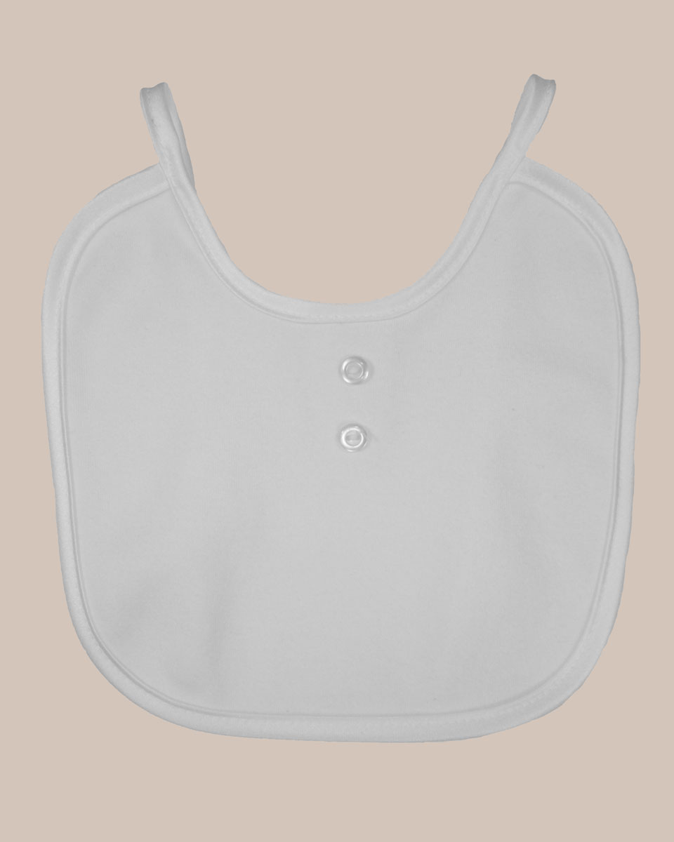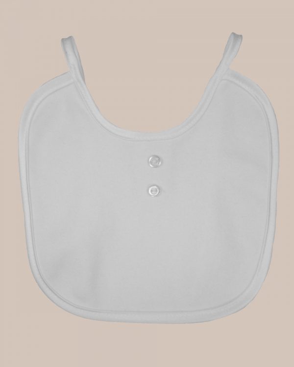 Baby 100% cotton knit interlock bib. Features an elegant raised piping hem and a simple two button design. This bib is great in for all occasions, but perfect for Christening, Baptism or any special occasion. Hand wash. Approximately 7″ x 7″. (1CB13XB) (6WIXBU)