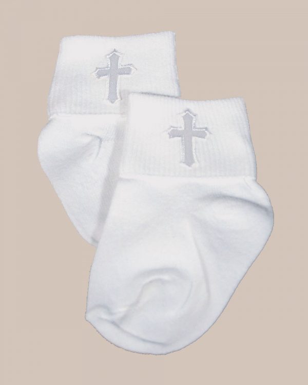 White 100% cotton fine gauge plain anklet christening sock with embroidered cross applique for use with any of our boys Christening Sets. Size: NB, SM, MD, 1-2, 3-5, 6-8, and 9-11.  (2005CR) (2005YC) See size chart in images for measurements.