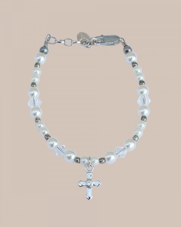 Shop One Small Child » White Pearl Crystal Cross Girls Sterling Silver Bracelet