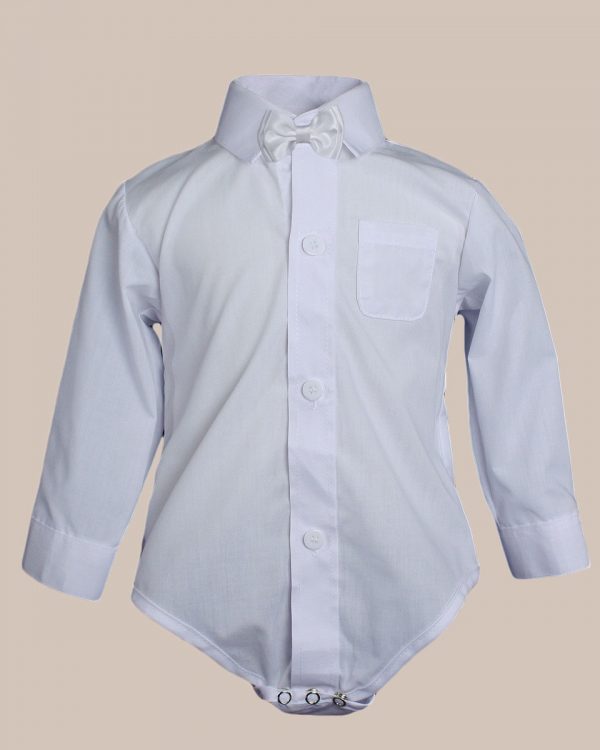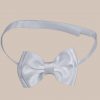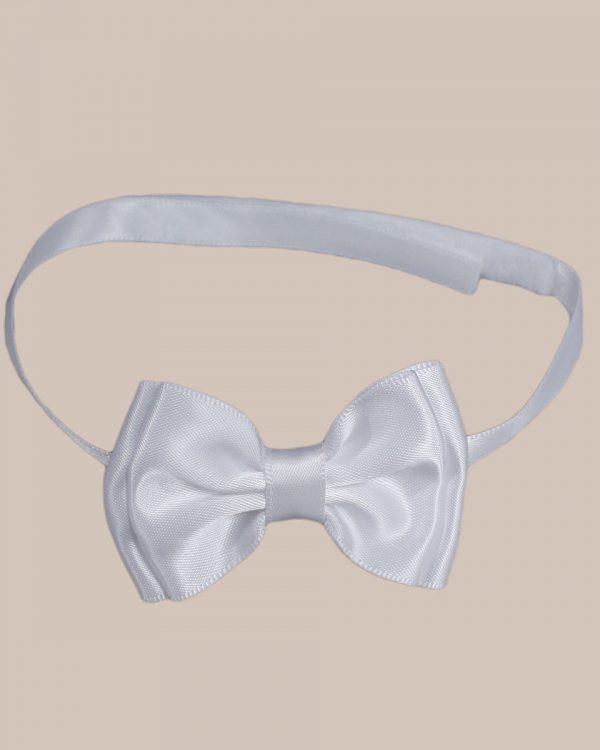 Handsome solid white satin pre-tied bow tie for infants. This fancy bow tie features a sophisticated layered look, soft ribbon neck strap, and adjustable velcro on the back of the strap for the best fit. Perfect for Baptisms, Christening, church, formal events, or any other special occasion! (WBOWTI)