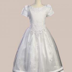Full-length, soft stretch lace really is enchanting and lends itself to twirls of fun for her Baptism Day.  Fully-lined with sheer lace sleeves.  Ties in the back for the perfect fit with zipper for easy on and off.  Beautiful option for baptism or first communion.  Made in the USA from 100% Polyester.  There is a 10% restocking fee for returns.