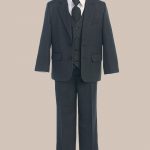 - 5-Piece formal boy's suit includes Jacket, Pants, Vest, Shirt, Tie