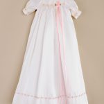 Simple and pure, this white satin christening gown is adorned with touches of soft pink for a perfectly feminine effect.