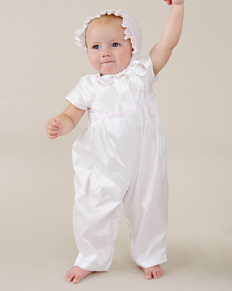 She showcased a lot in this shoot, items pictured here are: Lettuce-Edge Pima Knit Blanket, Camisole Bodysuit, Cotton Diaper Covers, Suzie After-Christening Outfit, Silver Plated Christening Rattle, Carnation Halo Headband.