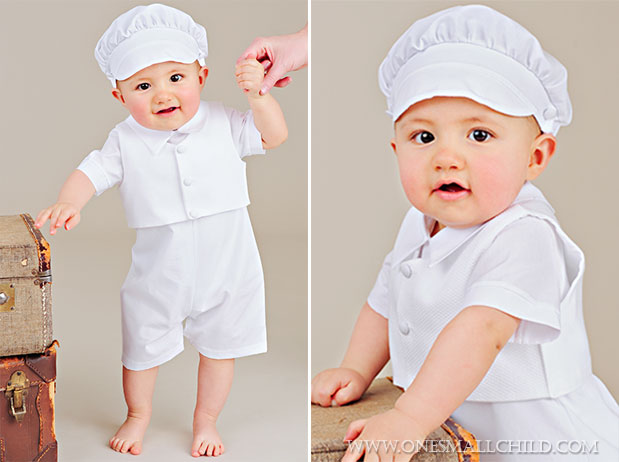 We love when little boys are all dressed up, and nothing beats our silk boys Christening suits! We’ve added the new Kingston to our collection of event outfits for boys. Let me tell you all about it! We started with a soft cotton bodyshirt. (A comfortable and classic addition to any little gentleman’s wardrobe.) Then we added clean-cut silk dress shorts and an adorable three-button suit jacket. A classic tie and visor beret hat polish off his look. We love the layers of this outfit! They add tons of versatility, so you can change up his look to get just what you want!