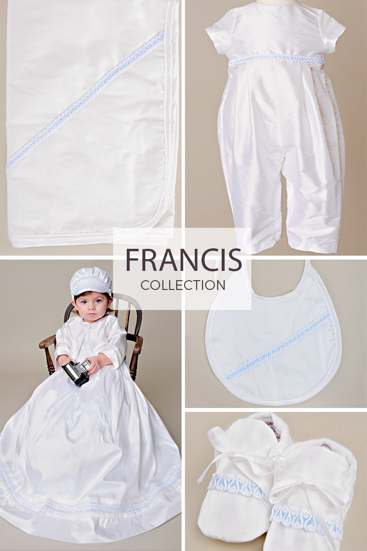 The Francis collection was named after the current pope: Pope Francis I. The Francis is a simple, modern Christening outfit. The newsboy hat and regal length add subtle traditional touches. Each item is hand-crafted with fine dupioni silk. A touch of blue gives a masculine essence to each piece. The collection includes: baptism gown, after-Christening romper, jacket (not pictured), blanket, bib and shoes.