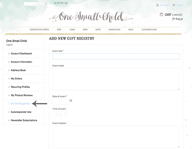 2. Once your account is created and you are logged in, you are ready to start.  While in your account you will notice a menu on the left side of the screen.  Click on “My Gift Registries”.  Create-registry