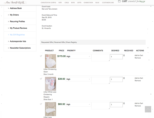 4. Now for the fun part!  It’s time to enter your favorite Christening clothing, matching accessories, jewelry, and more!  Just click on the category of choice on the menu bar at the top of the page.  Then find an item you want to add to your registry.  Select a size and click on the “add to registry” located next to the “add to cart” button.  When finished you can go back to your registry to view the selected items.Items