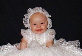 Our thanks to Jennifer, who sent this photo of her ADORABLE daughter in our Lucy lace christening gown, and commented: