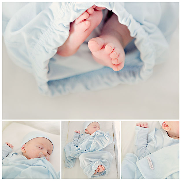 Our new four-piece layette sets come with a fun kimono-style top with ribbon tie closure. Aren’t the elbow patches adorable? The pants have a stylish slit on the leg opening and a cute pocket on the seat. So fun! The set also comes with a comfy hat and stretchy blanket that’s great for swaddling. These boys sets are available in white or blue.