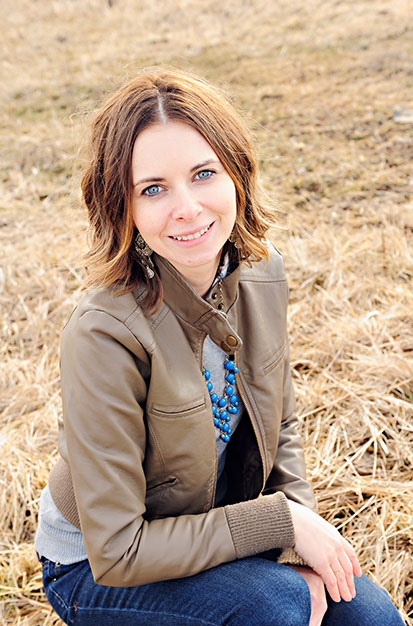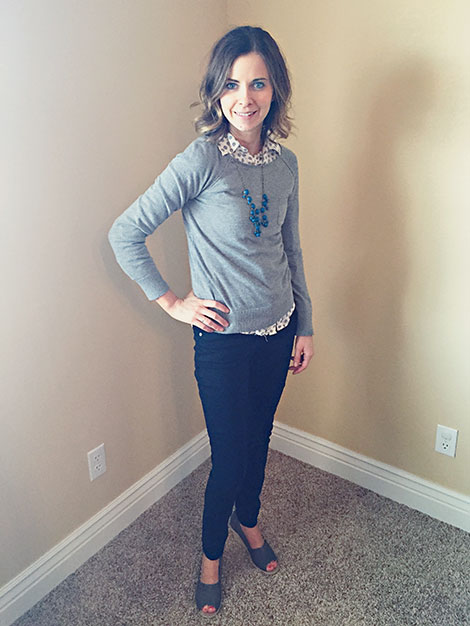 Layer a bright green sweater over a plain white tee and a gray-wash jean. A pop of orange complete the look with the fun necklace and comfortable flats.