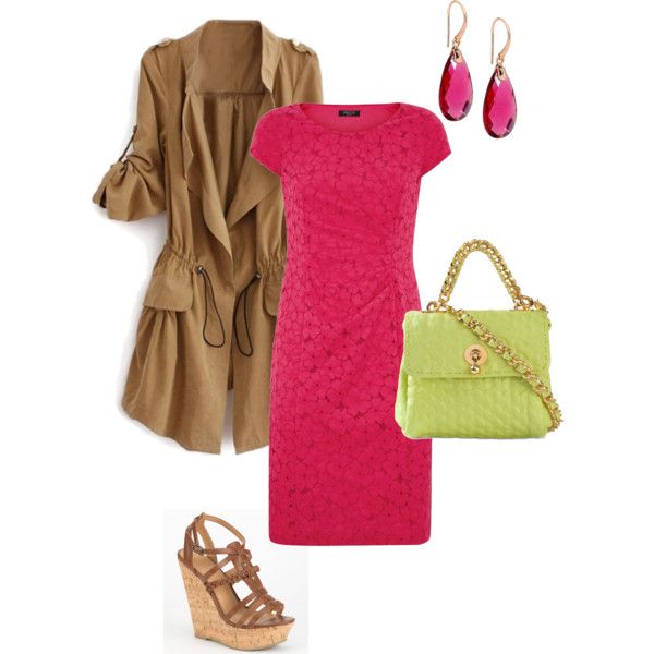 What says spring more than a textured raspberry dress? Support this vibrant color with a tan trench coat and strappy (mom-friendly) wedges. A celery green handbag adds an fun pop of color.