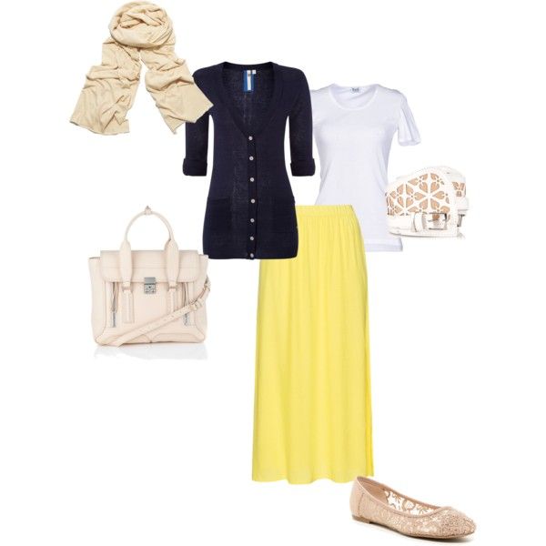 Textured accessories become the neutral in this easy spring look. Lacy flats, a nude scarf and bag let the clothes do the talking. A flowy yellow maxi skirt is feminine and comfortable for mom. A lace belt at the waist of the navy cardigan accentuates your waistline.