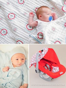{Snug and cozy! Baby is wrapped in a muslin swaddle blanket from our Aden and Anais Boy Gift Tote.}