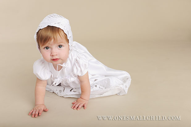 Have you seen our selection of winter Christening dresses? The weather may be frightful, but our Avery Christening gown is simply delightful! Made from luxurious bridal satin, for an exquisite Christening debut. Laser cutting and pretty beading decorate the bonnet and hem of the gown. A thick satin bow gives the bodice a rich feminine look. The three-piece set includes the Avery gown, matching bonnet and cotton slip. Make the Avery truly special! Personalization on the slip is available just for your little princess!